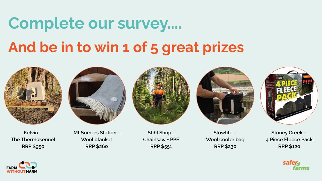 It only takes 10-15 minutes, and your feedback helps guide the future direction of our work and ensures we are making the biggest impact we can on health, safety and wellbeing on New Zealand farms. Plus every completed survey goes in the draw to win 1 of 5 great prizes!